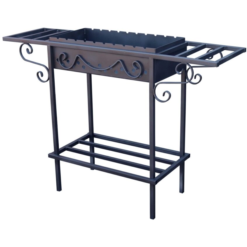 2 мм и покрытие теплостойкой краской. Мини-столики по бокам, на которых комфортно готовить мясо или ставить уже готовые шашлыки.