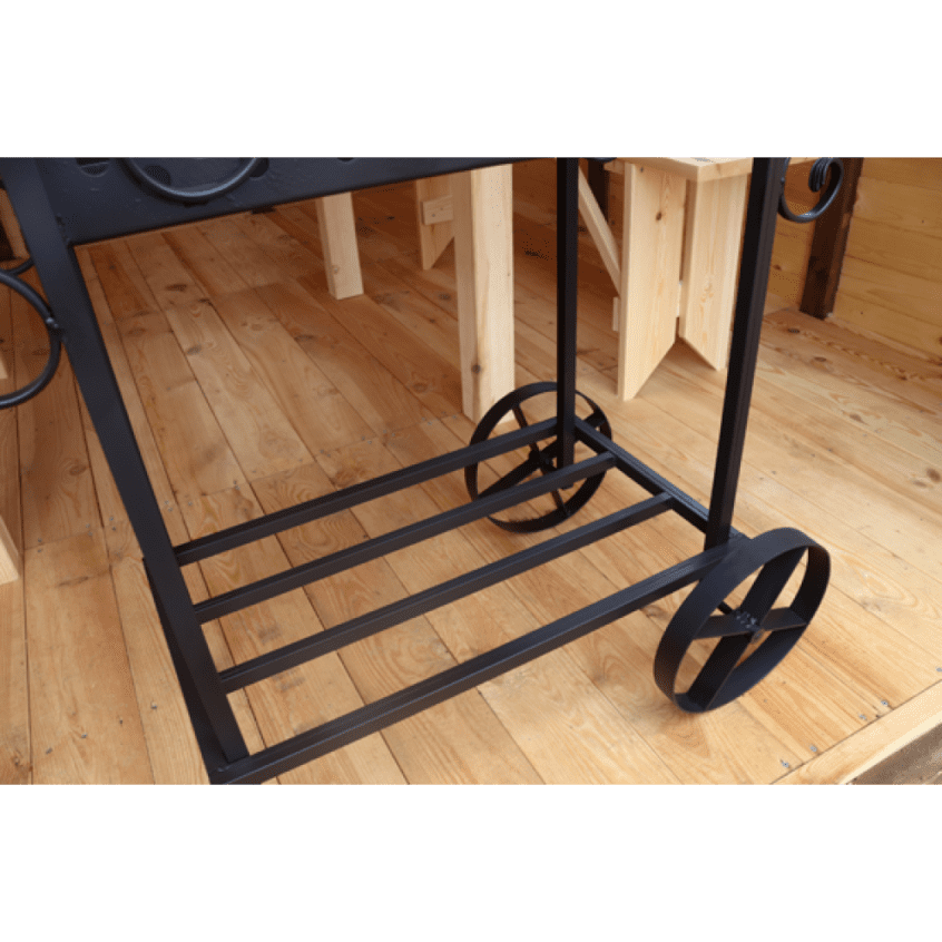 Мини-столики по бокам, на которых комфортно готовить мясо или ставить уже готовые шашлыки. Внизу оборудована поленница для хранения растопки и колеса для перемещения мангала по участку.