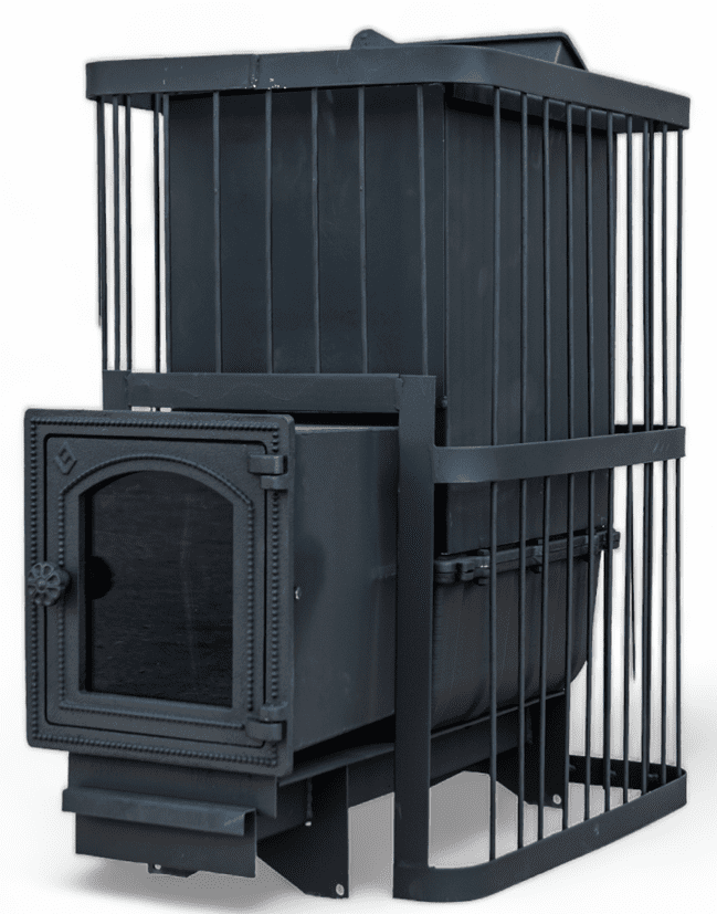 Печь также вмещает до 200 кг камней, что способствует формированию оптимального микроклимата в парной и созданию качественного пара. Чугунная дверь с прозрачным стеклом не только обеспечивает герметичность, но и позволяет следить за процессом горения, что добавляет удобства при использовании.