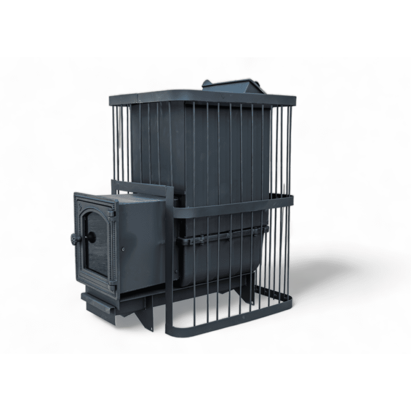 Каменка открытая, максимальный вес камней 160 кг. Длина дров 50 см. Подойдет для парных до 26 м. куб.