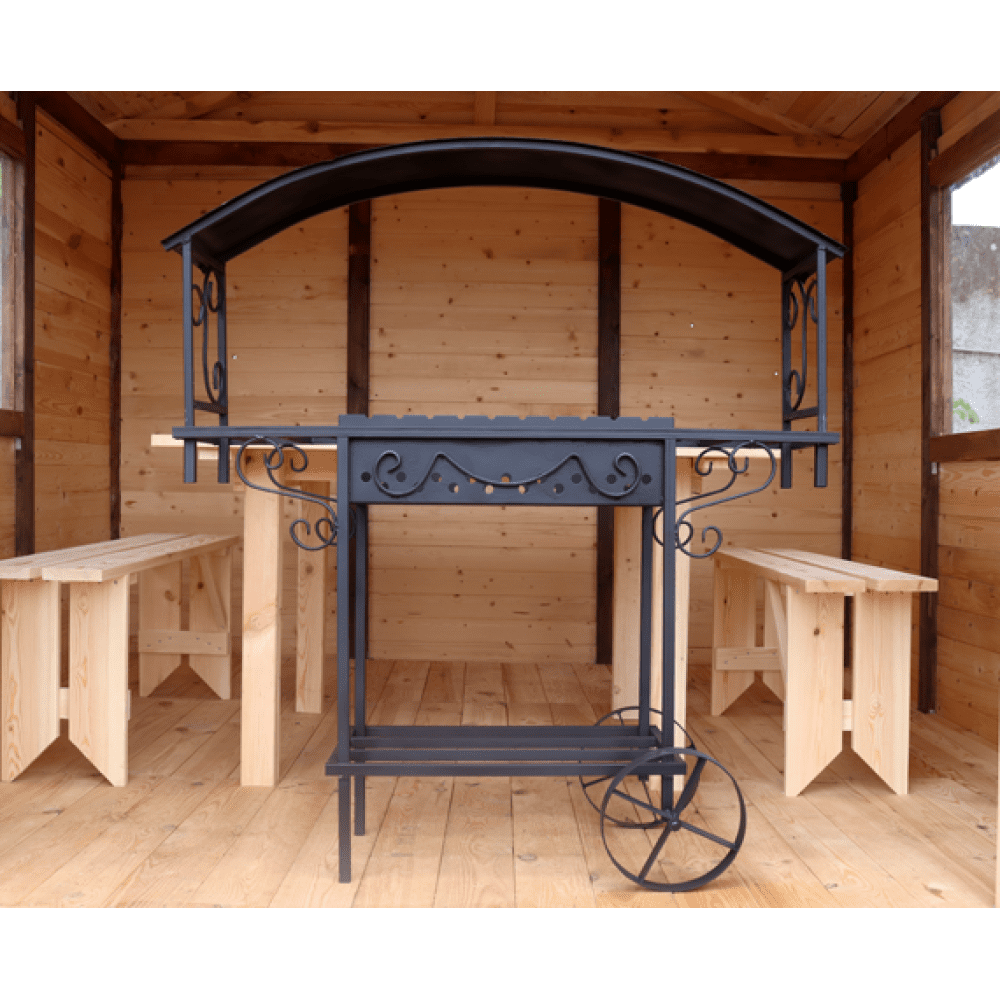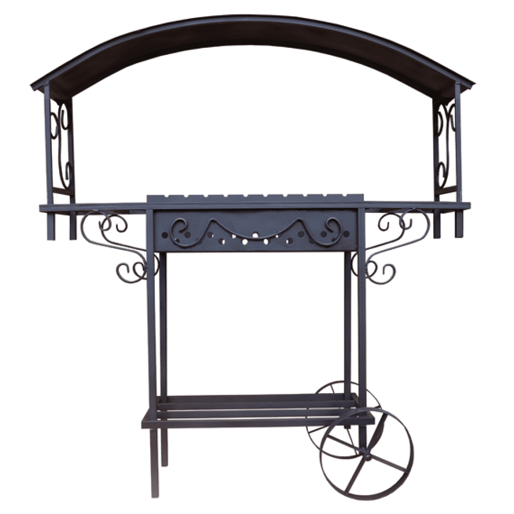 Мини-столики по бокам, на которых комфортно готовить мясо или ставить уже готовые шашлыки. Внизу оборудована поленница для хранения растопки и колеса для перемещения мангала по участку.Над жаровней есть крыша, которая защитит продукты и огонь от непогоды.