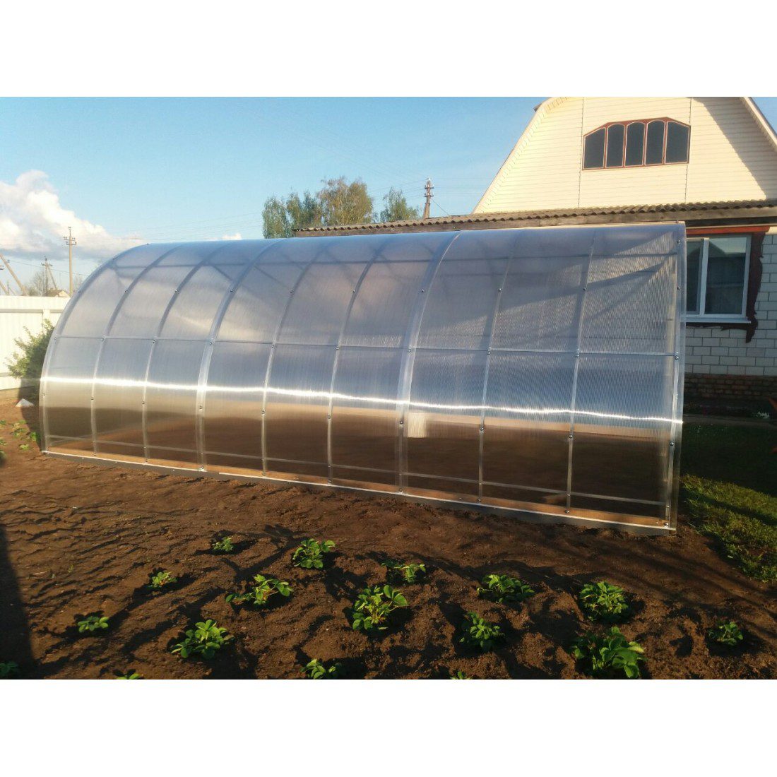 Высота теплицы 2,3 метра. Высота конструкции позволяет с удобством выполнять все работы, растения беспрепятственно растут вверх. Подходит для выращивания высокорослых и вьющихся сортов.